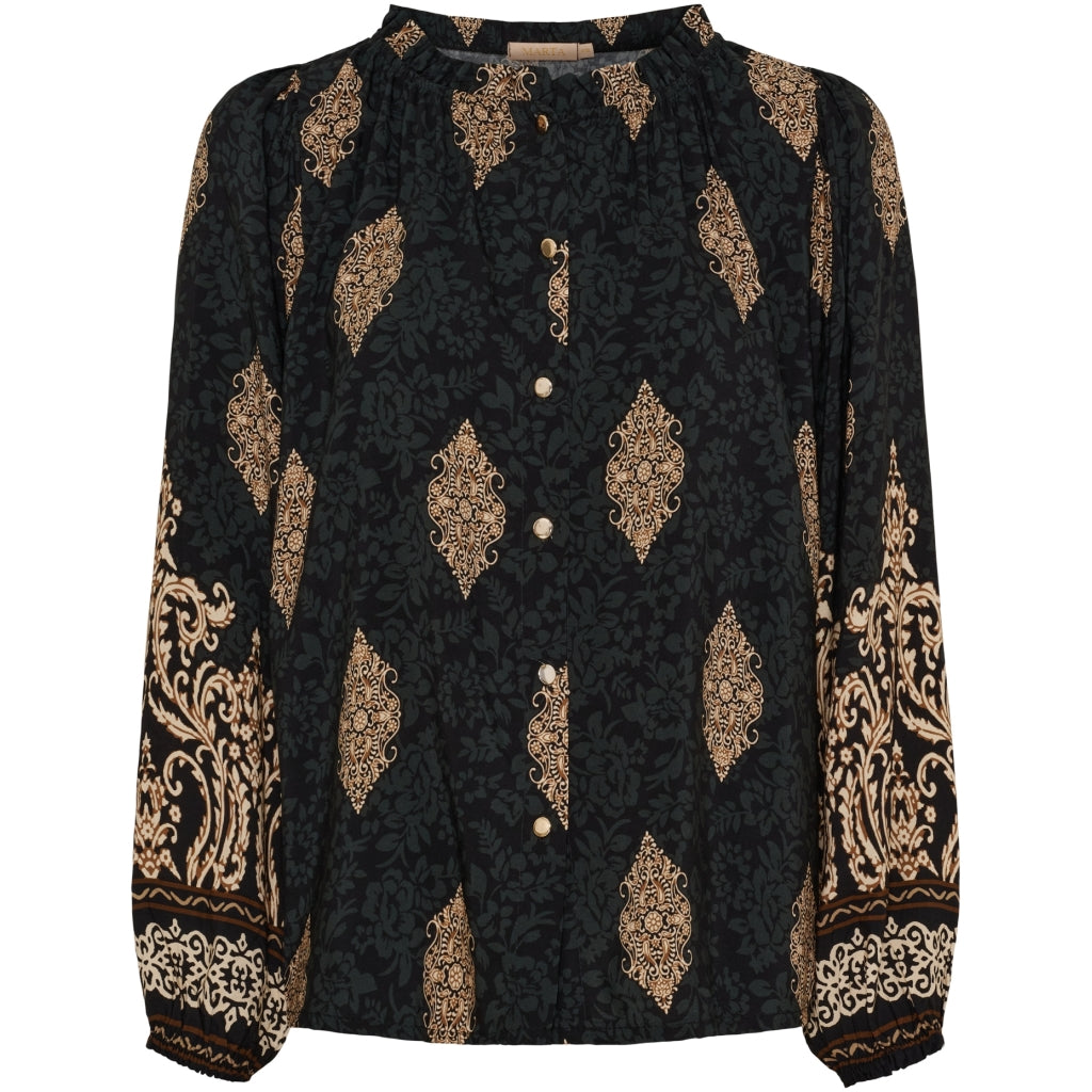 Elegant dameskjorte med guldknapper fra Marta du Château er et must-have for den stilbevidste kvinde. Denne skjorte kombinerer elegance og komfort. Hvilket gør den perfekt til både hverdag og fest.