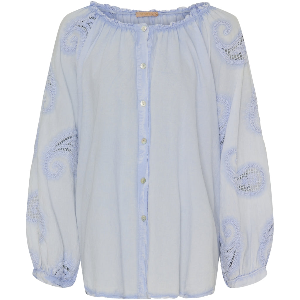 Elegant hulmønstret skjorte til kvinder. Marta Du Chateau er et uundgåeligt valg for den stilbevidste kvinde. Denne MDC Patty skjorte fra Sky Fashion House byder på et unikt hulmønster på ærmerne. Som giver et feminint og sofistikeret præg.