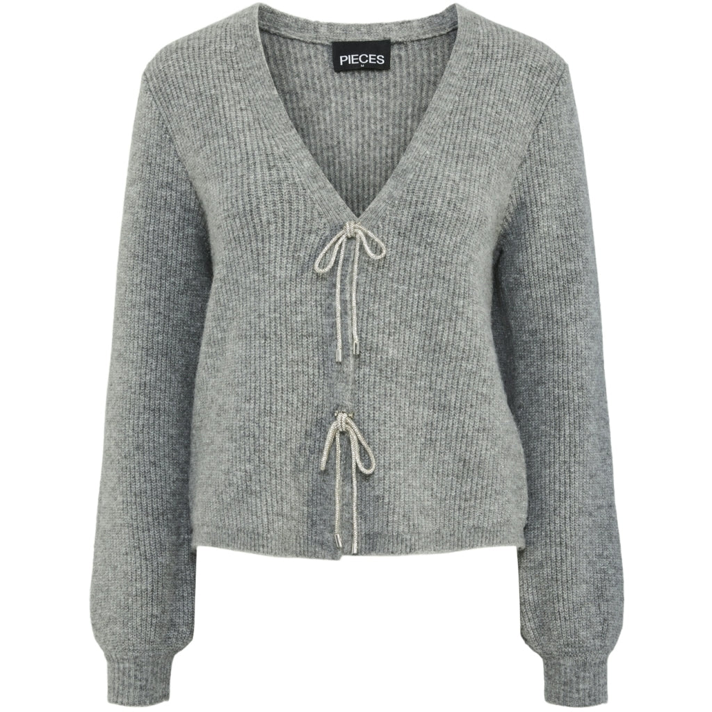 Glamourøs grå cardigan med glitrende sløjfe er et uundgåeligt valg for den stilbevidste kvinde. Denne cardigan fra PIECES forener elegance og komfort. Hvilket gør den ideel til både dagligdags brug og festlige anledninger.
