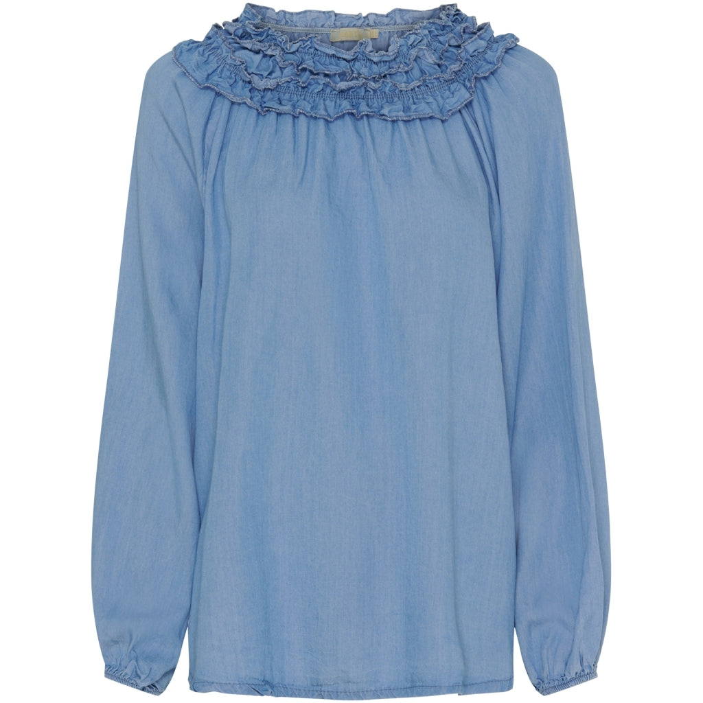 Marta Du Chateau bluse MdcJulietta. Lys blå med flæser er uundgåelig for den stilbevidste kvinde. Denne bluse kombinerer elegance med komfort. Hvilket gør den ideel til enhver anledning.