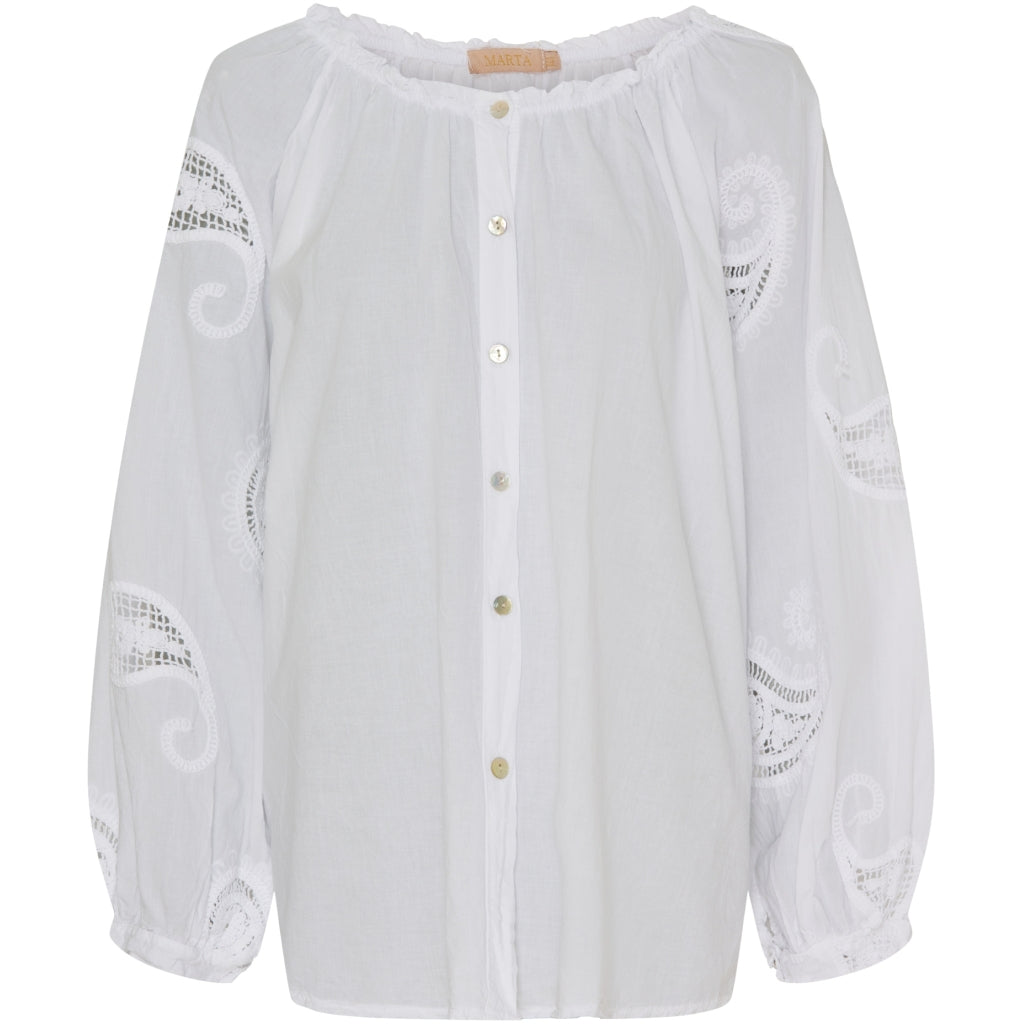 Marta Du Chateau MdcPatty skjorte. Hvid hulmønster er et essentielt valg for den stilbevidste kvinde. Denne skjorte forener elegance og komfort. Hvilket gør den ideel til både hverdag og festlige lejligheder.