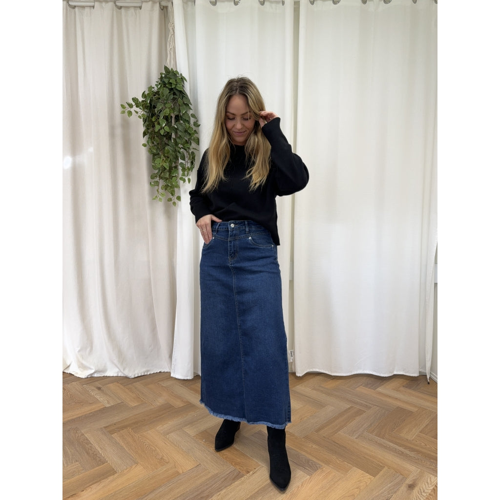 Stilfuld denim nederdel med slids. Et uundgåeligt stykke til din garderobe. Jewelly dame nederdel JW723 er skabt til den moderne kvinde. Der ønsker, at forene elegance med komfort.