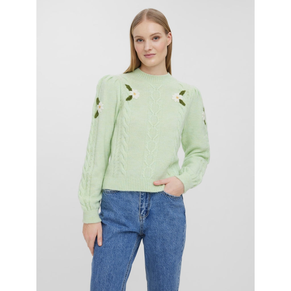 Vero Moda strikbluse med blomsterbroderi. Brook Green er en essentiel del af din garderobe. Blusen. VMJESABEL. Forener stil og komfort. Ideel til både hverdag og fest.
